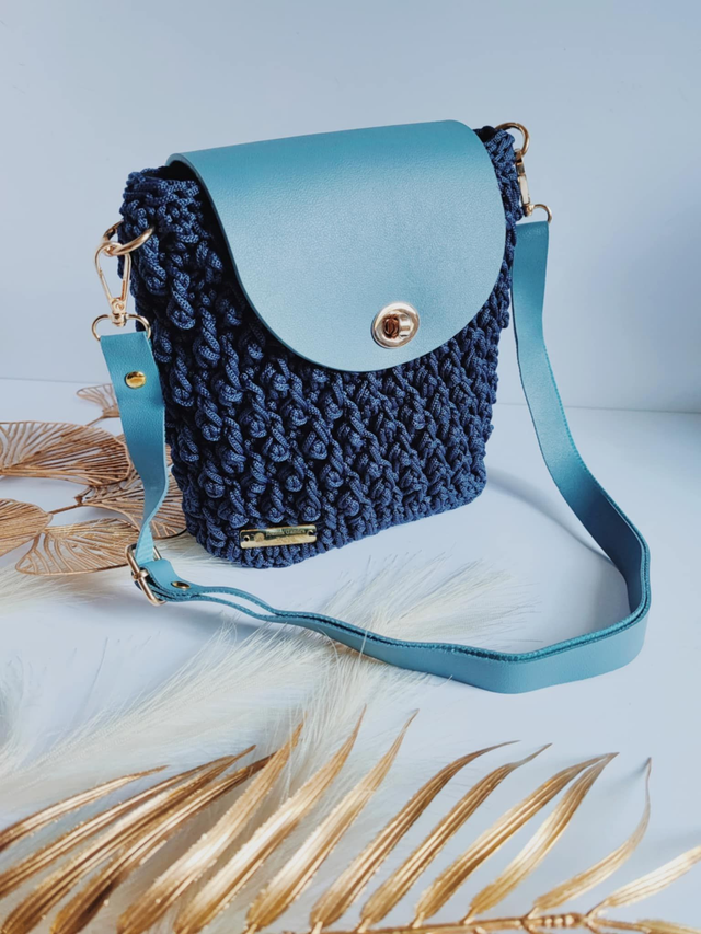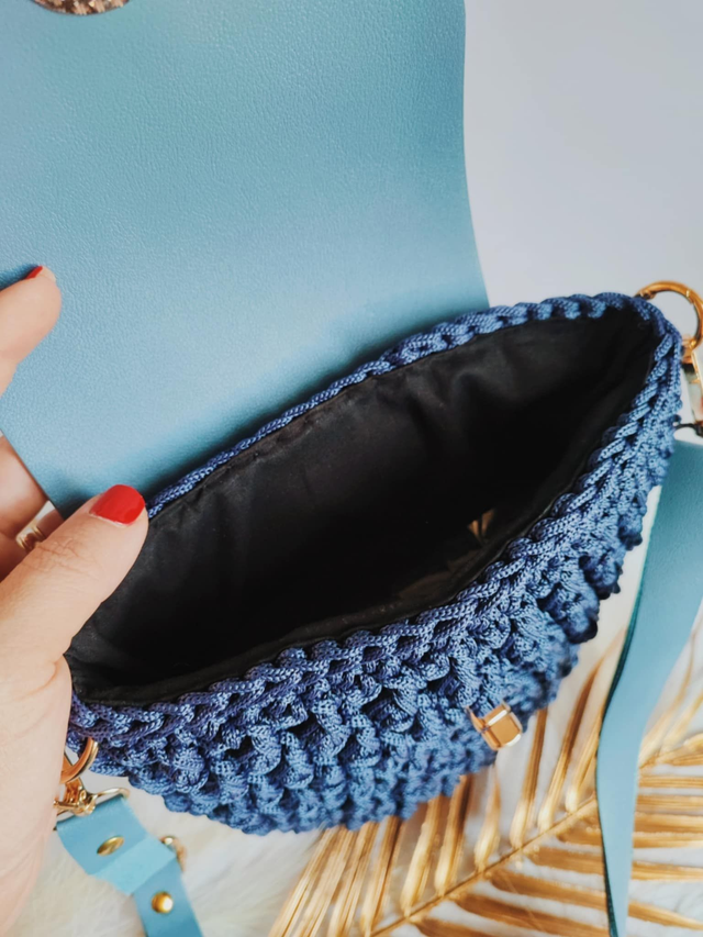 Handmade in crochet with a deep blue satin yarn and light blue vegan leather details.